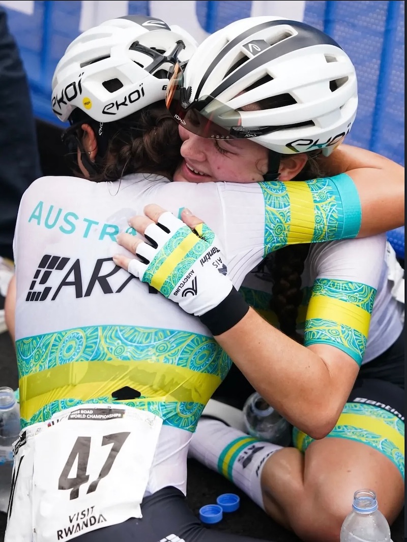 What a wild first worlds campaign. I couldn’t be more grateful and proud to wear the green and gold and have the support and belief from so many people. I knew it wouldn’t be easy, no race ever is, and it was worlds. In saying this, the TT was quite far off for what I had trained and knew I was able to do however it taught me so much. I was emotional and it hurt however I knew I needed to bounce back fast because I had a road race to focus on. Going into the road race, if you told me I would be placing 13th in world I would have be so stoked. I drove the pedals with hunger and finally some belief in myself. Towards the back end of the race I was testing the girls on the cobbles because I simply had good legs. Coming into the final lap, I found myself slightly down positioning wise so I had to really fight to make the back of the front group on the brutal cobbles climb, I made it and we were away - some 8 girls. Unfortunately in the final climb I was caught up in an incident and then had to ride with everything I had. Wrong time and place sadly. I am happy to come away with 13th but knowing I was there and in the front group means possibly a different story. But that’s why we love bike racing, throws curves, you find a way everytime to bounce back.